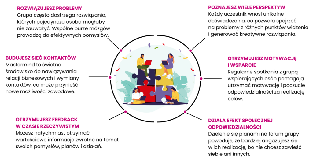 Dzięki mastermind nie tylko szybciej osiągniesz swoje cele, ale także stworzysz wartościowe relacje biznesowe i osobiste. To grupa wsparcia i inspiracji na najwyższym poziomie!